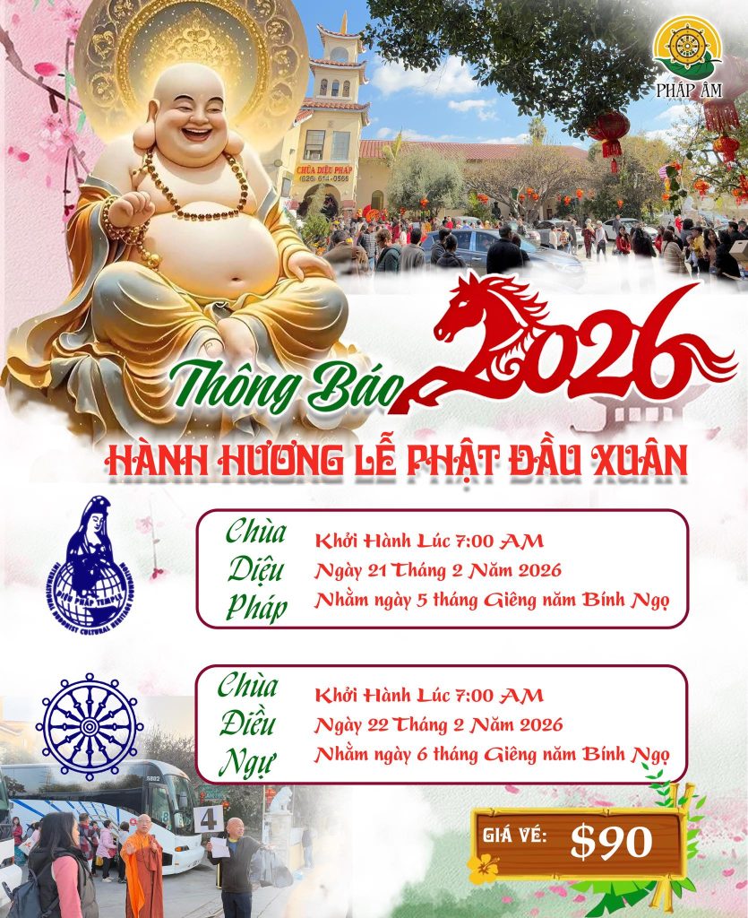 Chùa Diệu Pháp và Chùa Điều Ngự trân trọng thông báo tổ chức Chương Trình Hành Hương Lễ Phật Đầu Năm, kính mời quý Phật tử cùng gia đình tham gia.