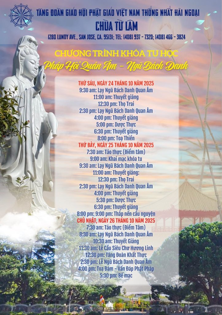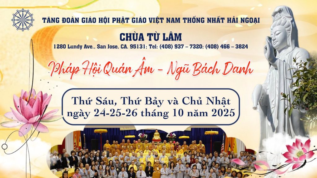 Để tạo thắng duyên tu học cho toàn thể Phật tử, nhân ngày Lễ Vía Bồ Tát Quán Thế Âm, Tăng Đoàn Giáo Hội Phật Giáo Việt Nam Thống Nhất Hải Ngoại và chùa Từ Lâm tổ chức Khóa Tu Học – Pháp Hội Quán Âm, lễ lạy Ngũ Bách Danh Quán Thế Âm trong 03 ngày: