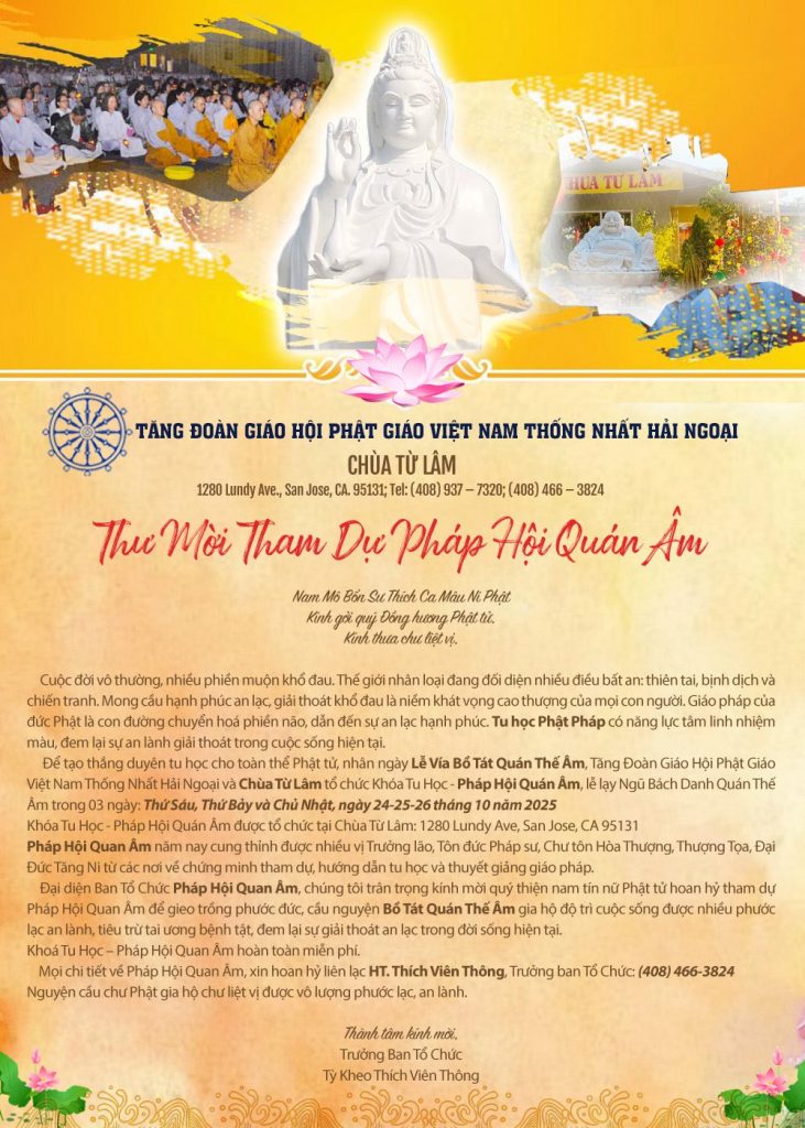 Mọi chi tiết về Pháp Hội Quan Âm, xin hoan hỷ liên lạc HT. Thích Viên Thông, Trưởng ban Tổ Chức: (408) 466-3824