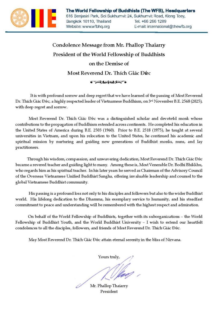 Thay mặt Hội Liên Hữu Phật Giáo Thế Giới, cùng các đoàn thể trực thuộc – Thanh Niên Phật Giáo Thế Giới và Đại Học Phật Giáo Thế Giới – tôi xin gửi lời phân ưu chân thành nhất đến toàn thể môn đồ, pháp quyến và thiện hữu tri thức của Hòa Thượng Tiến Sĩ Thích Giác Đức.